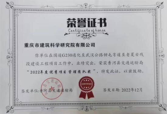 國道G230通武線項目,投資總估算約為13.36億元,全長5.3公里,全線采用雙向六車道一級公路標準建設,設計速度80公里/小時,全線設特大橋1座。2022年6月20日正式開工建設以來,市建科院始終堅持高效統(tǒng)籌、科學調度,在保證質量和安全的前提下,督促項目監(jiān)理部切實發(fā)揮監(jiān)理職能,要求總承包項目部優(yōu)化施工組織,協(xié)助政府相關部門強化拆遷調度,為項目質量、安全和投資年度目標的實現(xiàn)打下夯實的基礎,截止目前已完成投資約5.05億元,實現(xiàn)安全生產“零”事故,并獲得主管部門頒發(fā)的2022年度“優(yōu)秀項目管理團隊獎”。
