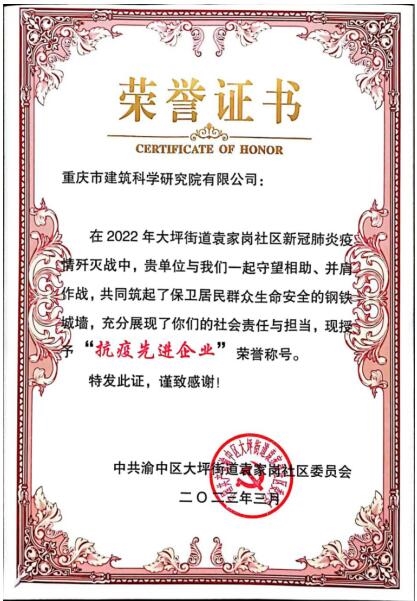 323日,大坪街道召開“疫”路有你,與愛(ài)同行——暨抗疫“最美黨員”表彰大會(huì),為在2022年大坪街道袁家崗社區(qū)新冠肺炎疫情殲滅戰(zhàn)中表現(xiàn)優(yōu)秀的社會(huì)團(tuán)體與個(gè)人頒發(fā)榮譽(yù)證書,市建科院公司獲“抗疫先進(jìn)企業(yè)”榮譽(yù)稱號(hào)。