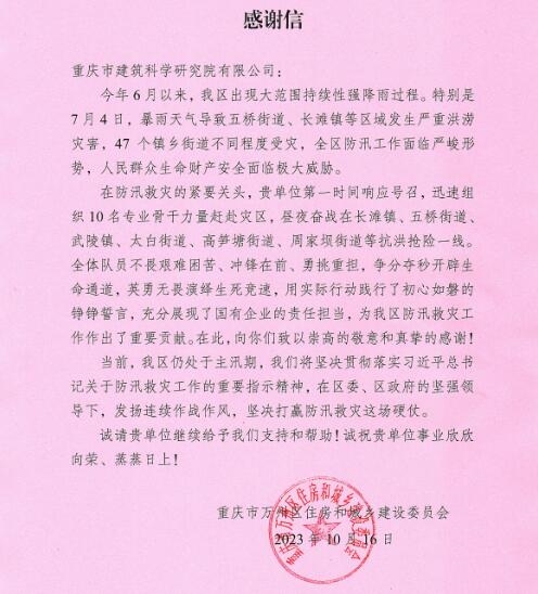 今年6月,重慶市萬州區(qū)五橋街道、長灘鎮(zhèn)等區(qū)域發(fā)生嚴重洪澇災(zāi)害,在防汛救災(zāi)的緊要關(guān)頭,市建科院公司第一時間響應(yīng)號召,緊急調(diào)派房屋鑒定專家團隊前往災(zāi)區(qū)開展搶險排險工作,晝夜奮戰(zhàn)完成了五橋街道、太白街道、周家壩街道、高筍塘街道、武陵鎮(zhèn)和長灘鎮(zhèn)等主要受災(zāi)區(qū)域共計440棟房屋的災(zāi)后隱患排查工作,充分展現(xiàn)了國企責(zé)任擔(dān)當(dāng),獲重慶市萬州區(qū)住房和城鄉(xiāng)建設(shè)委員會感謝信。