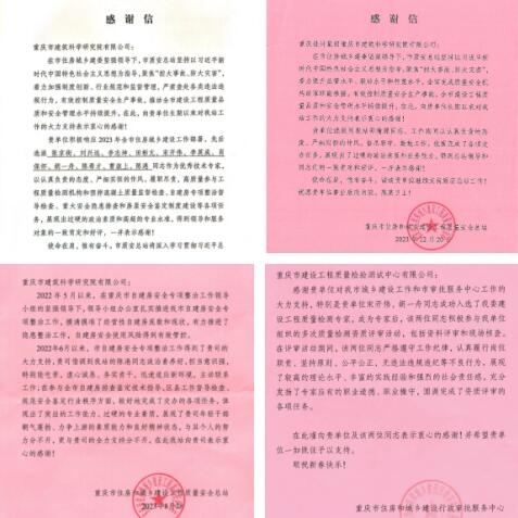 2023年,重慶設(shè)計集團市建科院公司全面貫徹落實黨的二十大精神,緊緊圍繞市委市政府戰(zhàn)略部署,在全面服務(wù)重慶城市建設(shè)發(fā)展中奮楫爭先、勇挑重擔(dān),先后收到重慶市住房和城鄉(xiāng)建設(shè)工程質(zhì)量安全總站、重慶市住房和城鄉(xiāng)建設(shè)行政審批服務(wù)中心、重慶市萬州區(qū)住房和城鄉(xiāng)建設(shè)委員會等十余個單位的數(shù)封感謝信、表揚信,信中充分肯定了市建科院公司2023年在重大工程建設(shè)、應(yīng)急搶險等方面所做的貢獻,并表達了誠摯的感謝。
