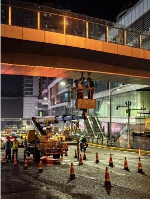 天橋位于商業(yè)區(qū),天橋上下人流、車流量較大,且天橋外側(cè)加裝了鋁板裝飾層,無(wú)形中為現(xiàn)場(chǎng)檢測(cè)工作帶來(lái)了難度。為盡快完成本次檢測(cè),同時(shí)減少現(xiàn)場(chǎng)檢測(cè)工作給游客及交通帶來(lái)的影響,本次檢測(cè)選擇在夜晚進(jìn)行。我司組織了在檢測(cè)、鑒定領(lǐng)域具有豐富經(jīng)驗(yàn)的專家及檢測(cè)人員進(jìn)駐現(xiàn)場(chǎng),在最短時(shí)間完成了檢測(cè)方案編寫、天橋計(jì)算分析、交通占道方案審批、現(xiàn)場(chǎng)檢測(cè)工作準(zhǔn)備以及橋梁外觀檢查、靜載和動(dòng)載試驗(yàn)以及欄桿推力試驗(yàn),圓滿完成檢測(cè)任務(wù),為天橋結(jié)構(gòu)的安全提供了有力的技術(shù)保障,為橋上打卡游客的人身安全保駕護(hù)航。