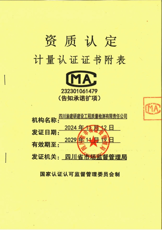 近日,重慶設(shè)計(jì)集團(tuán)市建科院公司所屬子企業(yè)四川渝建研建設(shè)工程質(zhì)量檢測有限責(zé)任公司(簡稱“四川渝建研公司”)在檢測技術(shù)領(lǐng)域取得重大突破,CMA(檢驗(yàn)檢測機(jī)構(gòu)資質(zhì)認(rèn)定)資質(zhì)參數(shù)由566項(xiàng)成功擴(kuò)增至1132項(xiàng),公司檢測資質(zhì)范圍由原先的“四大類”增至“八大類”,擴(kuò)項(xiàng)后公司檢測技術(shù)能力再上新臺階,滿足了水利工程檢測資質(zhì)必須參數(shù)需求,位居四川省檢測機(jī)構(gòu)中上游水平。
