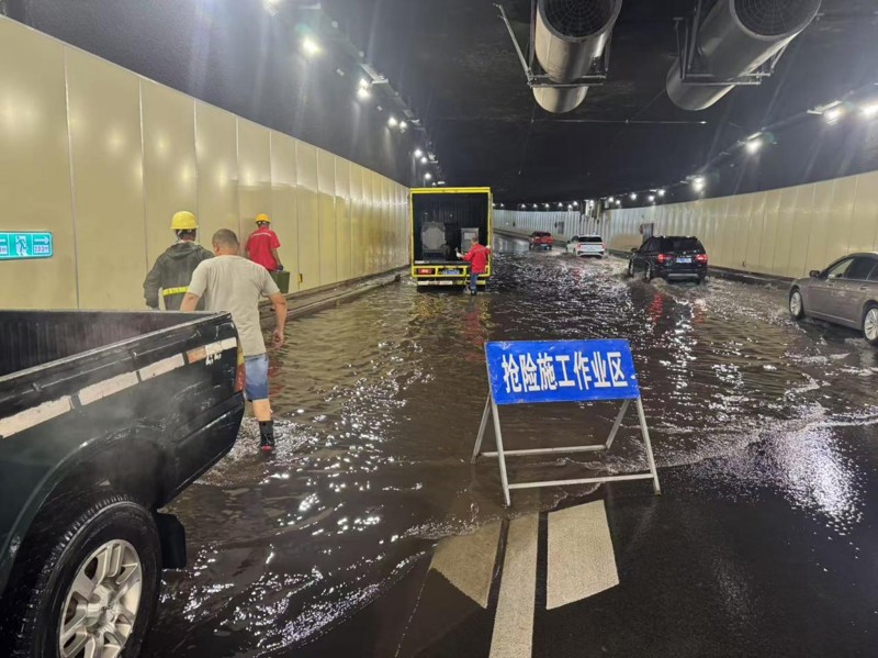 某區(qū)某隧道因地勢低洼且缺乏沉砂池,暴雨導致隧道中段嚴重積水,交通中斷。市建科院應急隊伍火速趕赴現(xiàn)場,會同市政管網(wǎng)管理及設施維護單位,徹夜奮戰(zhàn),采取緊急排水措施,全力保障隧道通行安全及結構穩(wěn)定。