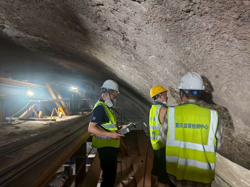 監(jiān)督檢測中心 主要承擔(dān)軌道交通27號線璧山站至磁器口站區(qū)段的工程質(zhì)量檢測任務(wù),其中對中梁山隧道區(qū)間的檢測涵蓋多項(xiàng)關(guān)鍵內(nèi)容:包括建筑材料、錨桿拉拔力、襯砌厚度、襯砌及背后密實(shí)狀況、錨桿錨固密實(shí)度、襯砌混凝土強(qiáng)度及保護(hù)層厚度等檢測。為確保項(xiàng)目如期貫通,市建科院統(tǒng)籌調(diào)配人員、設(shè)備資源,組建專業(yè)技術(shù)團(tuán)隊(duì),制定周密檢測方案。工作聚焦隧道襯砌結(jié)構(gòu)質(zhì)量檢測的核心環(huán)節(jié),高效推進(jìn)各項(xiàng)檢測任務(wù),以及時響應(yīng)、精準(zhǔn)可靠的數(shù)據(jù),為施工質(zhì)量筑牢保障防線。