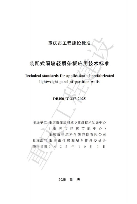 近日,由重慶設計集團所屬子企業(yè)重慶市建筑科學研究院有限公司(以下簡稱“市建科院”)聯(lián)合重慶市住房和城鄉(xiāng)建設技術發(fā)展中心編制的重慶市工程建設標準《裝配式隔墻輕質(zhì)條板應用技術標準》(DBJ50/T-337-2025)通過了重慶市住房和城鄉(xiāng)建設委員會的審批并發(fā)布,將于2025年10月1日起開始實施。